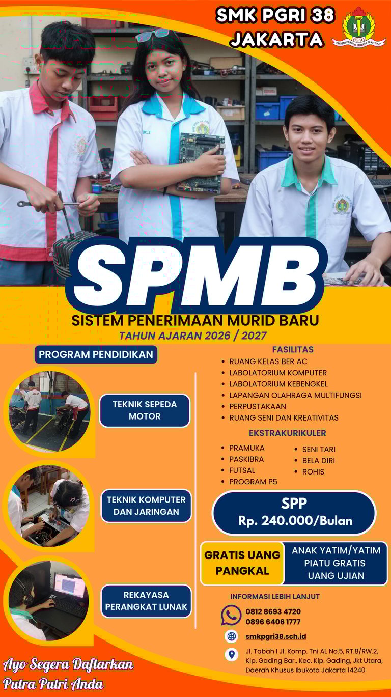 SMK PGRI 38 Jakarta menawarkan jurusan Teknik Sepeda Motor (TSM), Teknik Komputer dan Jaringan (TKJ), dan Rekayasa Perangkat Lunak (RPL) dengan fasilitas lengkap dan pengajar berpengalaman.